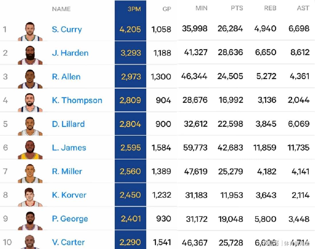 汤普森(2809个三分球)就像个神射手小火箭,“嗖”地一下,正式超越利拉德(2804个三分球),稳稳当当坐上了NBA史上三分球命中数榜单的第4把交椅,这简直就是三分线上的“武林高手”大升级嘛!