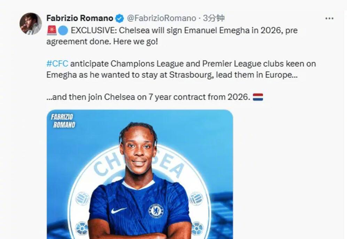 切尔西将于2026年签下埃马努埃尔-埃梅加,预先协议已达成。